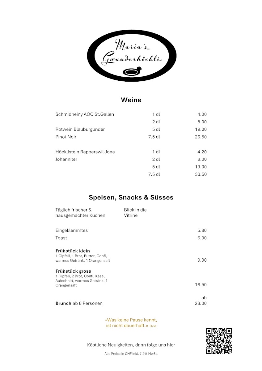 Although Maria's Gwunderhöckli is situated right on the bustling Hauptstraße, the intimate setting offers a respite from the outside world. This unique blend of convenience and coziness makes it an ideal choice for both locals and travelers alike looking to enjoy a quiet moment amidst their busy days.